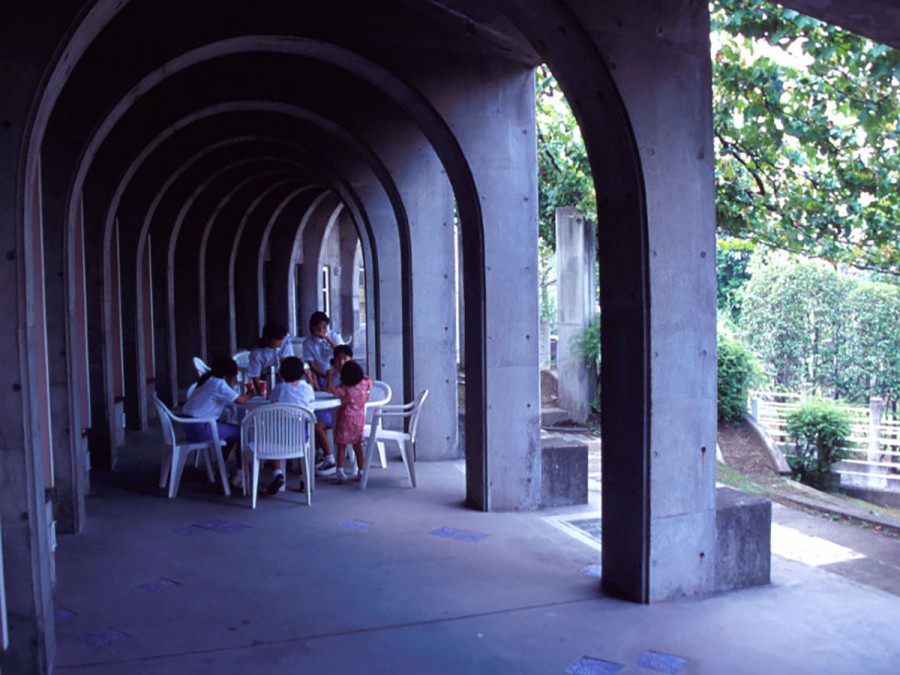コロネード、1階の回廊、二つの光路、南面するテラス、同心円状に、放射状に、また三角に切れ込む形に、中庭から屋上に向かって東西南北のグリッド状に、無数の柱が林立する。