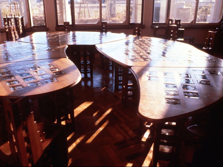 ダンダン‥‥‥イスの背、窓枠、柱の脚、光路の柱断面、ロビー天井、中庭、屋上。