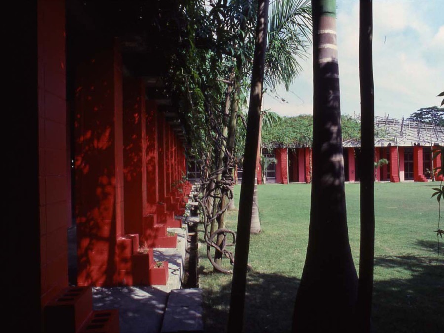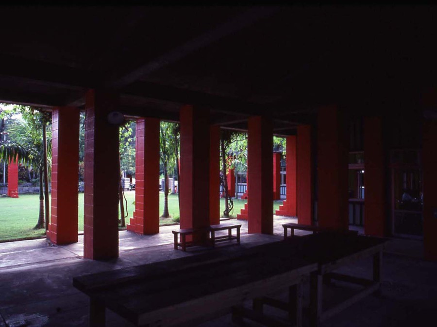コンクリートブロックで化粧された500角、2,250mスパン、277本の列柱、RC打放しの大屋根、分舎的に配置された各室または、各室を取りまいた柱によってできるアマハジという部分や、大屋根と柱だけで構成される小広場―沖縄古来の建築物でアサギがこれに似ている―など、内とも外ともつかない空間を生み出している。またここは内部と外部との連続性を強めているともいえる。人びとはここで飲み会、討論会、昼寝、展示会、大工仕事、ピンボン‥‥‥など、多彩な活動を繰り広げる。たとえば中庭で祭が催される時など、料理講習室は屋台、和室は準備・控室、講習室は室内休憩所、アマハジやアサギ的小広場は縁日の参道のような場として機能する。また大ホールでの結婚式、講習会や和室での討論会、図書室での読書で疲れた体や頭を休めるには、この半外部的空間はもってこいの場所である。このようにあいまいな空間の存在は人びとの多様な活動に対応し、建物の内部と外部というふうに区分けして考えることを不可能にしている。